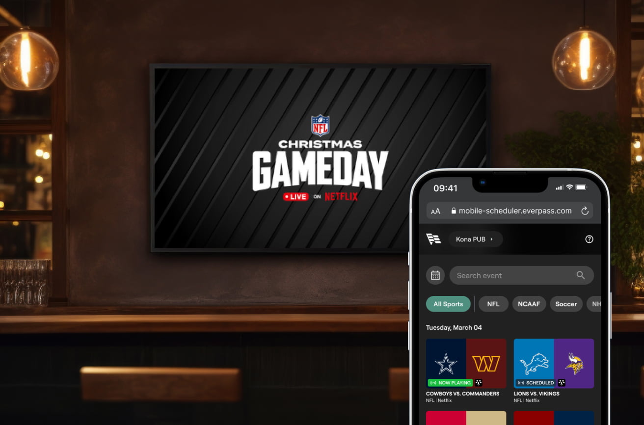 EverPass Core makes Netflix Christmas Gameday simple to stream in your venue — fully licensed, easy to manage, and paired with built-in marketing support to help you attract fans and grow revenue.